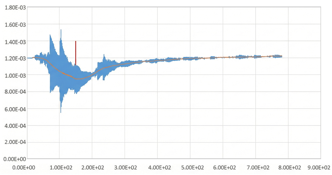System returns to initial position after shutdown (the red vertical line on the charts), confirming effect is not mechanical drift.